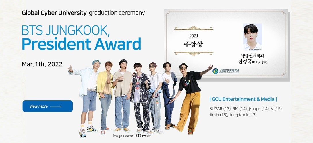 一方、先日行われたグローバルサイバー大学の学位授与式で、BTSのジョングクの学長賞受賞の感想動画がYouTubeで公開され、受賞の感想がTwitterのリアルタイム検索で1位になり、話題になりました。