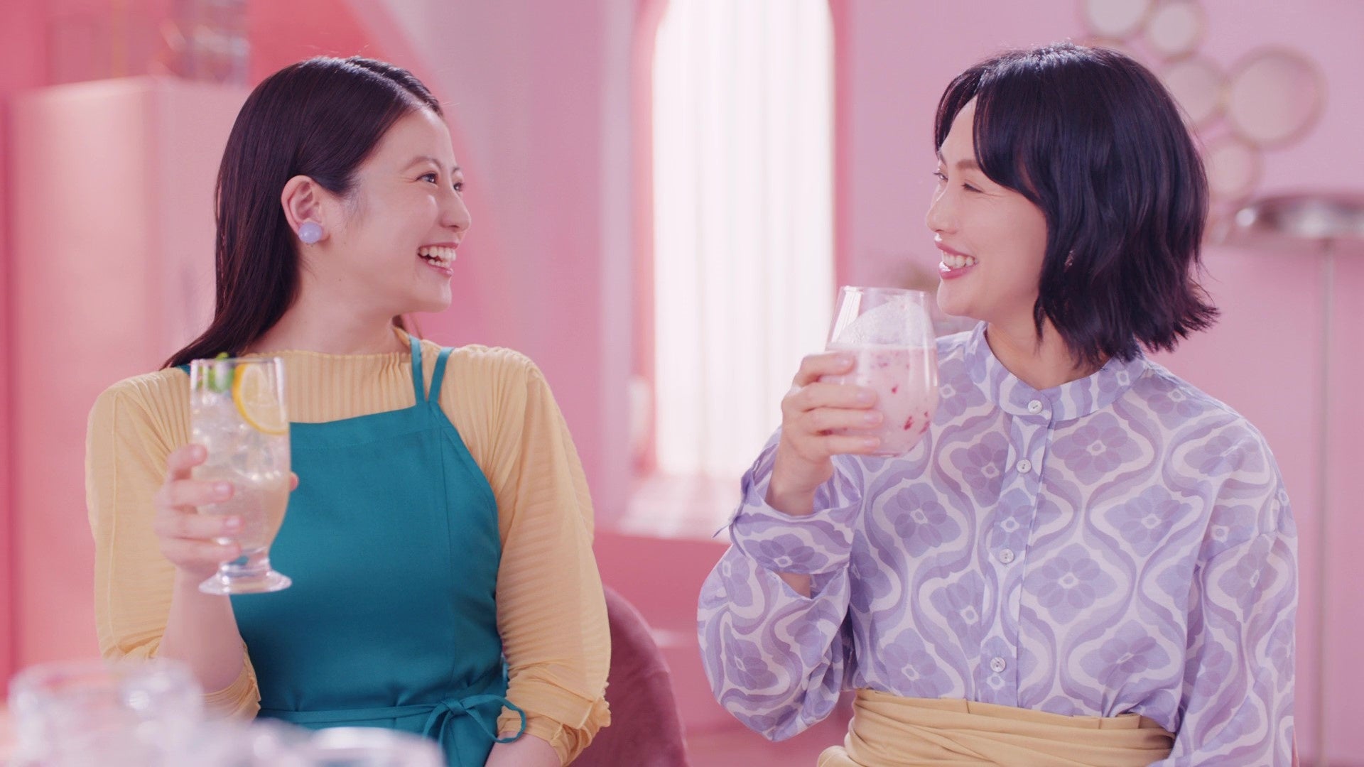 「つづけよう!美酢活」篇では、「いつもどんな飲み方してるの?」と美酢のアレンジを尋ねる臼田さんに今田さんが炭酸割りや豆乳、かき氷など様々なアレンジをテンポよく披露。アレンジの多さに「まだ続くの!」と驚く臼田さんを見て、満面の笑みでうなずきながら喜ぶ今田さん。美味しいアレンジを試して盛り上がった二人が「つづけよう!美酢活!」と無理なく続けられる美酢活をオススメします。