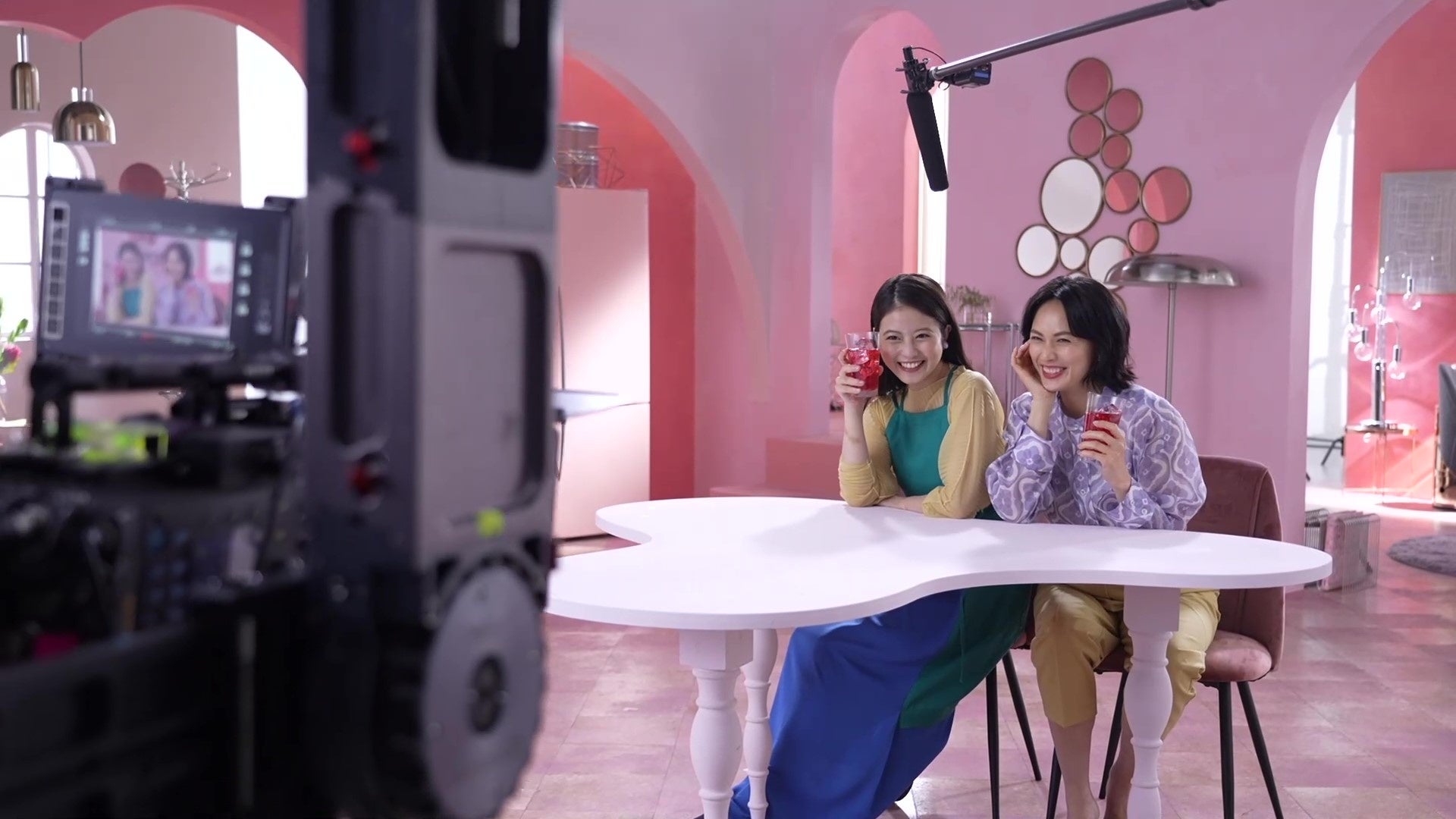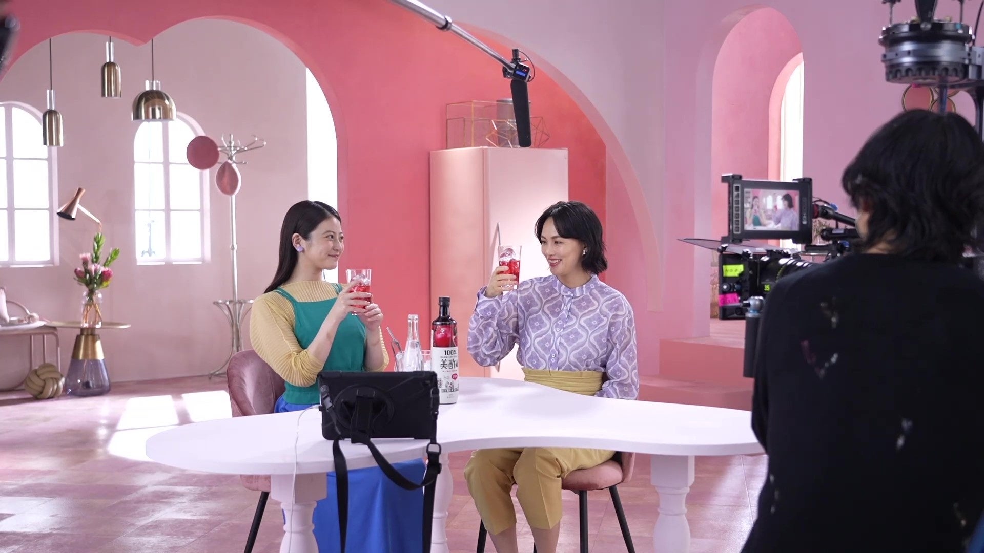 今田さん:今回は臼田さんとご一緒させていただいて、ピンクの世界観のなか臼田さんと会話をしながら美酢を楽しむという撮影で、とてもリラックスして楽しかったです。
