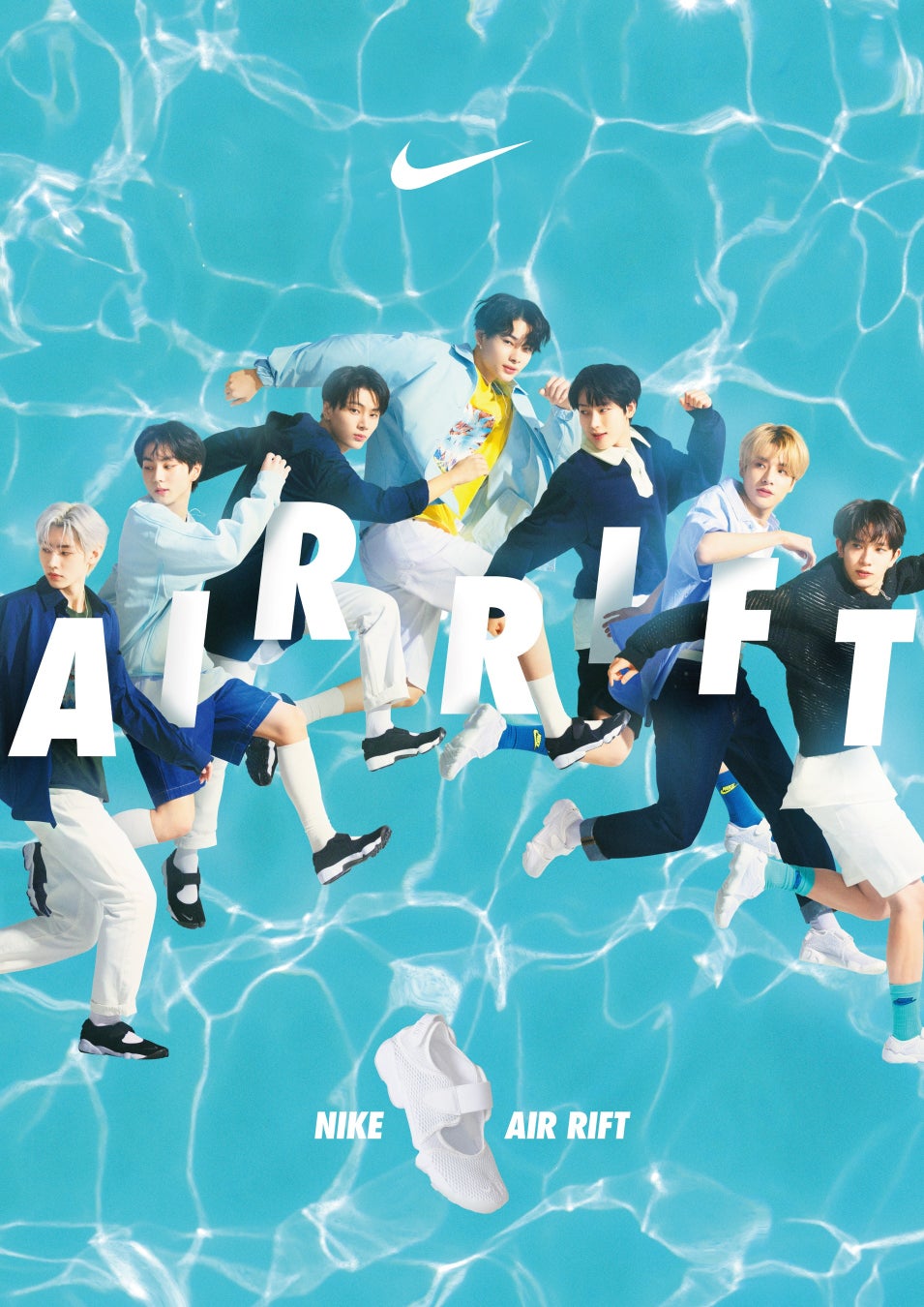 AIR RIFTでは、白やネイビー、ライトブルーなど涼し気な色合いをベースとしたスタイリングで、夏を想起させる水面をバックにメンバー7名で、 AIR RIFTの軽量さを演出しております。