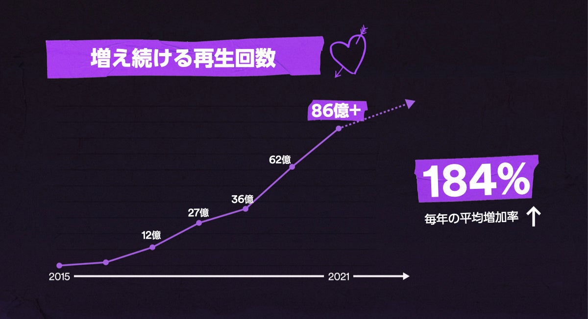 さらに、Spotifyに楽曲を配信してから258億回を超える累計再生回数を記録し、1曲以上のBTSの曲を追加したリスナーによるプレイリストの数は、7,800万を超えています。世界での再生回数の増加率は毎年平均して前年比184%を記録しており、2015年から2021年にかけて総再生回数は約185倍となりました。 Dynamite、Butter、Boy With Luv (feat. Halsey)、My Universe with Coldplay、そしてFAKE LOVEはSpotify上で最も再生された曲で、中でもアメリカ、フィリピン、日本、インドネシア、メキシコ、ブラジル、インド、イギリス、カナダ、そしてドイツで最も聴かれています。