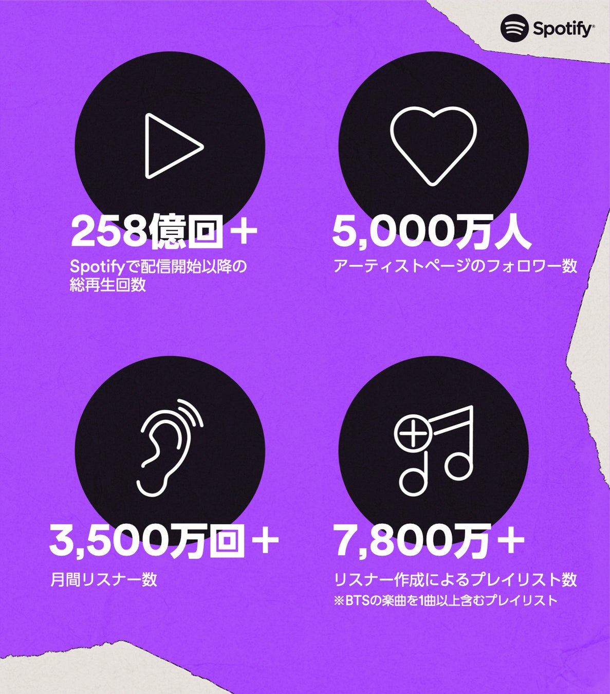 また、キャンペーンの一環として、Spotify上におけるBTSの記念すべきマイルストーンも公開しています。BTSは、月間リスナー数が3,500万人を超え、フォロワー数も世界中で5,000万人を超えるなど、Spotifyの数々の記録を更新してきました。BTSは「Spotify ビリオンズクラブ(10億回クラブ)」に加わったアジア初のK-Popアーティストとなり、彼らのヒットソング「Dynamite」は2021年7月に10億回再生を突破しました。プレイリスト「This Is BTS」は、世界中で展開する「This Is」プレイリストシリーズの中で、最も多い650万人を超えるフォロワーに愛されています。そして、BTSはSpotifyにおいて2021年に世界で3番目に再生されたアーティストとなり、また2021年に世界で最も再生されたK-Popソングではトップ5のうち4曲を占めています。