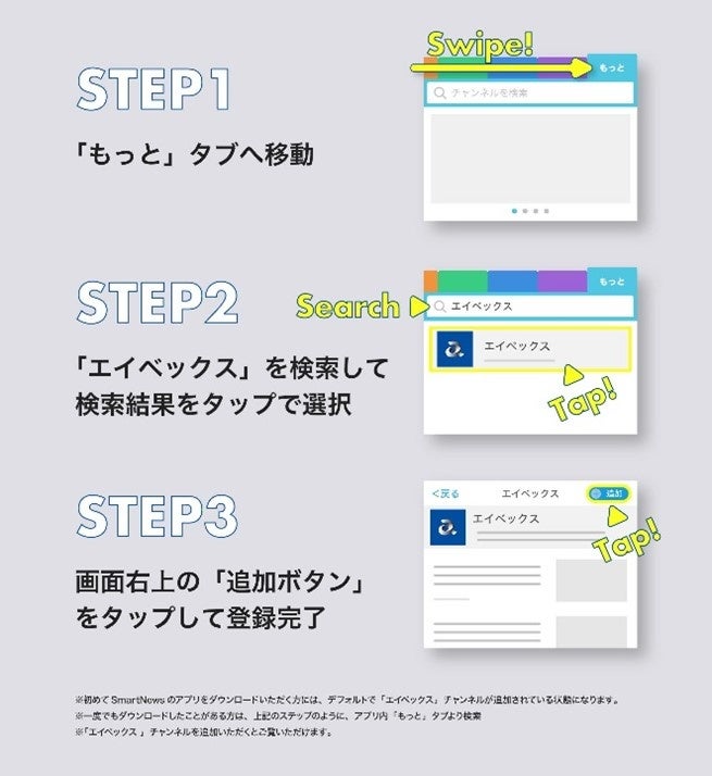 STEP1: SmartNewsアプリをダウンロード STEP2: SmartNewsから「エイベックス」と検索してチャンネル追加 STEP3: コラボブースにて「エイベックスチャンネル」を提示、限定グッズをゲット
