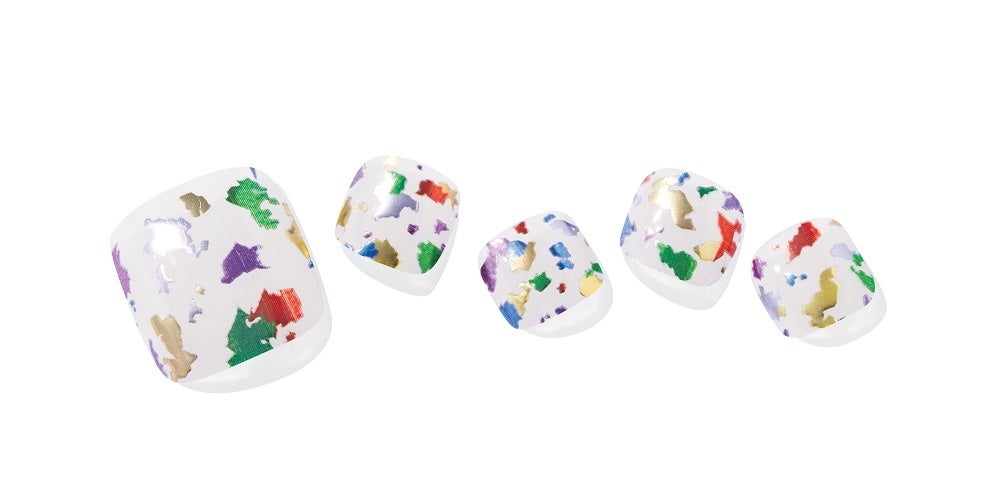 まるでジュエリーボックスをひっくり返したような、カラフルなのに軽やかで抜け感のあるペディ。その秘密は、カラーにしのばせた乳白ベース。素足にまとうだけで、Happyにきらめくアートが完成。ネイルを主役に、あえてシンプルなサンダルと合わせて。1660円