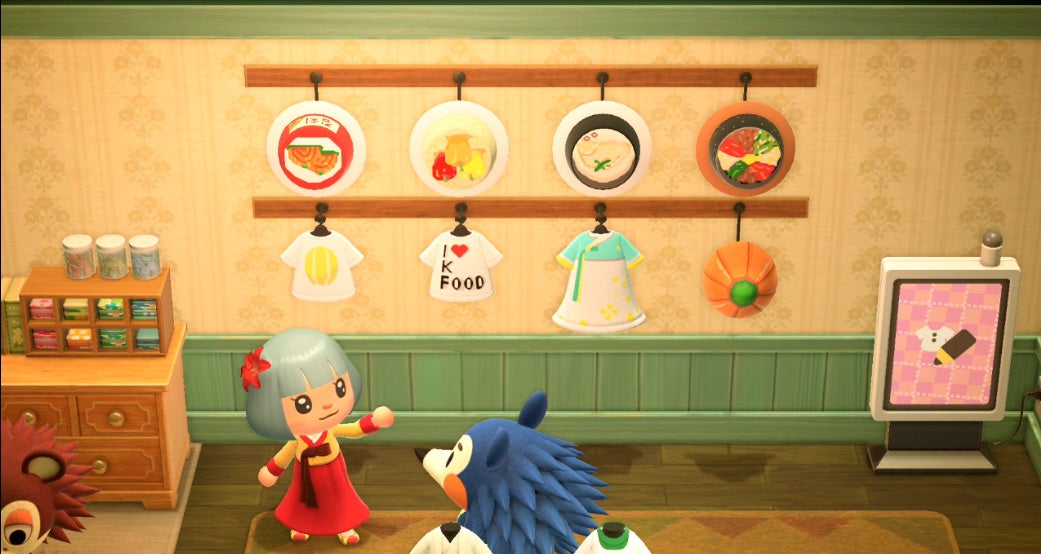 K-FOOD島では、韓国気分がグッとあがるチマチョゴリ風のワンピのほか、韓国食材をモチーフにしたシュールでポップな韓グルTシャツのマイデザインも配布!あなたはどのTシャツにする?
