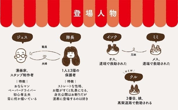 恋とは無縁で寂しがりやだった「僕」が「隊長」と出会い結婚し、3匹の元野良猫とくらす日常を描く。
