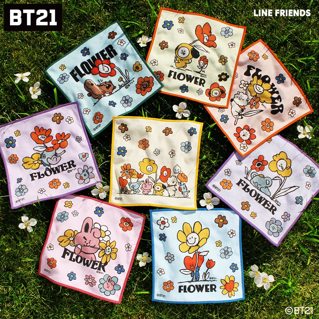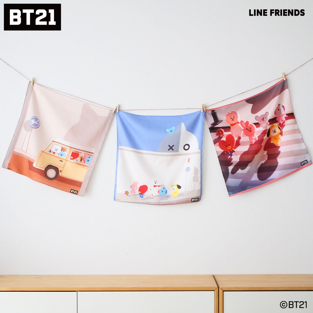 「BT21」のアートを大胆にデザインし、キャラクターたちが過ごす楽しい日々を表現しました。手を拭くのはもちろん、ファブリックポスターとしてお部屋に飾るのもおすすめです。