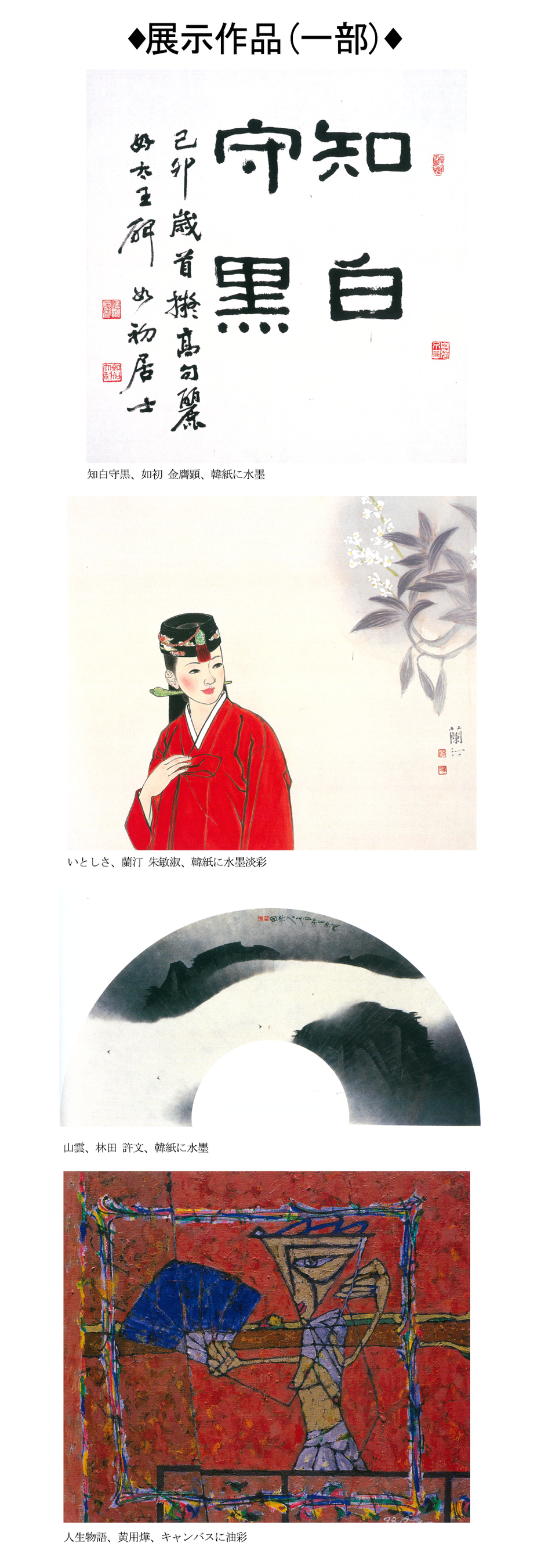この度の展示では、韓国の百科事典にも載っているほどの偉大な書家である金膺顕(キム・ウンヒョン)や、ソウルの崇礼門(南大門)の復元の上棟式に上棟文を書いた鄭道準(ジョン・ドジュン)の書道作品や、韓国画において大きな足跡を残した朴幸甫(パク・ヘンボ)、姜幸遠(カン・ヘンウォン)、朱敏淑(ジュ・ミンスク)や許文(ホ・ムン)などの大作家の作品はもちろん、韓国の情緒を西洋画に盛り込んだ黄用燁(ファン・ヨンヨプ)、尹明老(ユン・ミョンノ)などの作品も飾られます。(すべて原作品)
