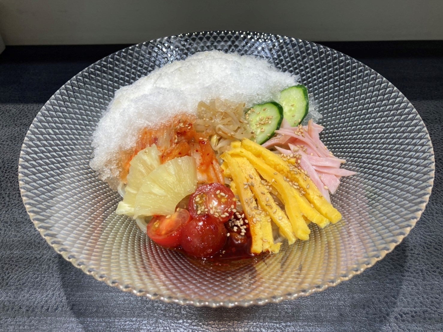 外に出れば太陽の光が痛いほど照りつけるこの気候に、もううんざり……という方も多いのではないでしょうか。口当たりがひんやりしたスイーツは巷に溢れているけれど、お食事だって冷たくさっぱりいただきたい、と思っている方におすすめしたいのが、この「かき氷冷麺」(税込880円)です。