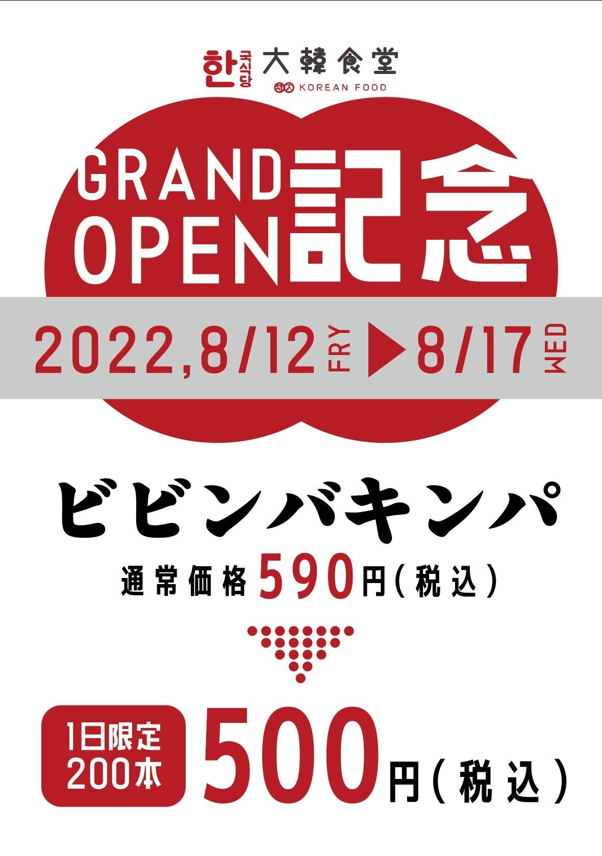また、OPEN記念キャンペーンとして8月12日~8月17日の期間、1日200本限定で「ビビンバキンパ」通常590円(税込)を特別価格500円(税込)にてご提供させていただきます。