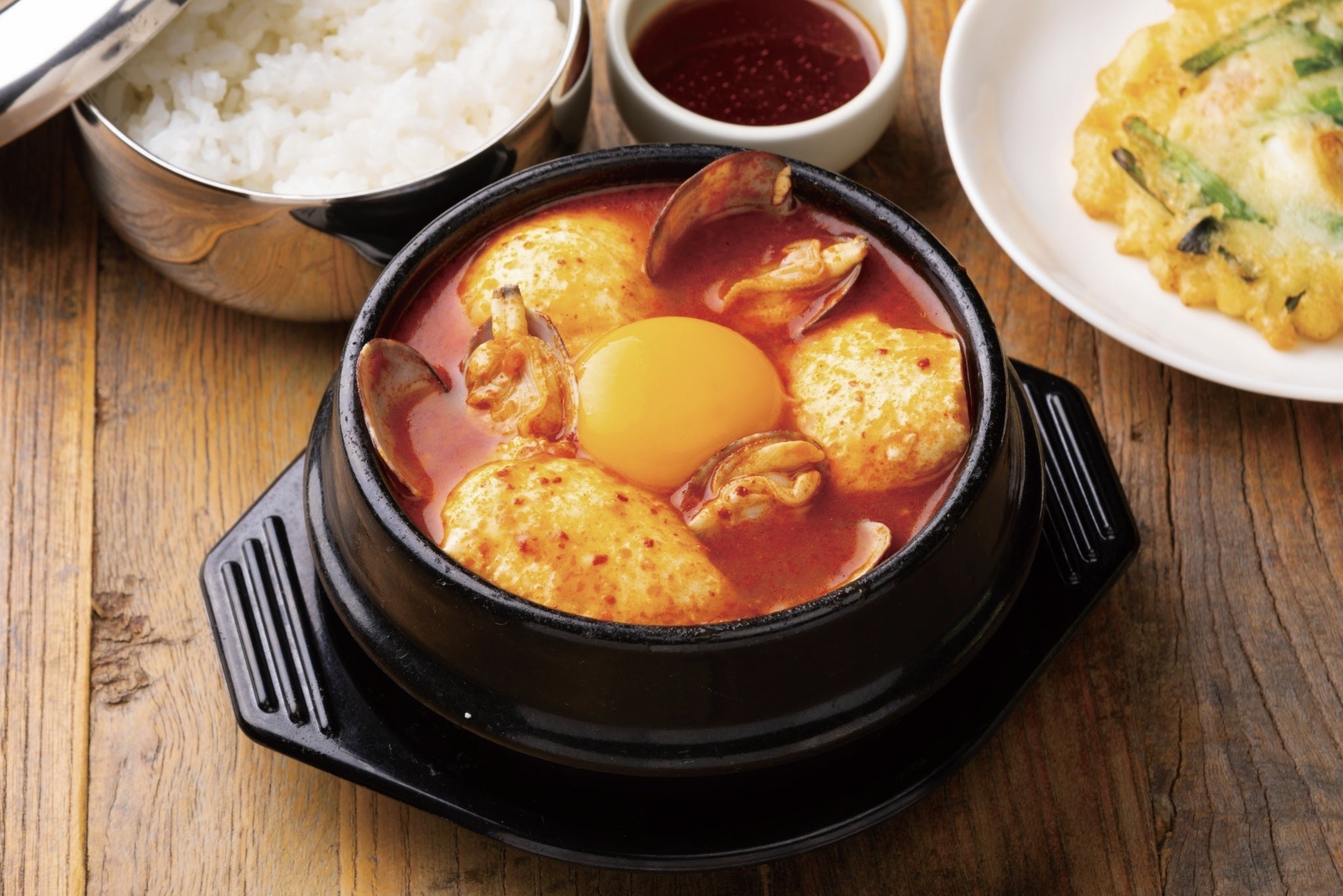 あさりの出汁が効いた濃厚でちょっぴり辛みがうまい!野菜、キムチ、海鮮にたっぷりの豆腐が入った具沢山のスンドゥブです。ごはんを入れてクッパ風でもお楽しみいただけます。