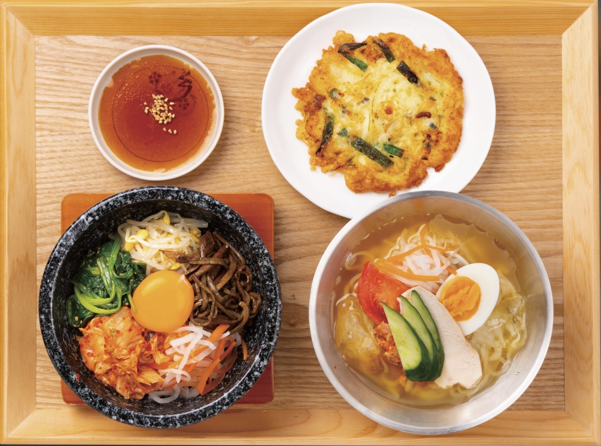 人気の石焼ビビンバと冷麺に店内で焼き上げた海鮮チヂミが付いたお得なセットメニュー。石焼ビビンバのナムルは手作りにこだわり本場韓国風に仕上げました。大韓食堂イチオシのセットメニューです。