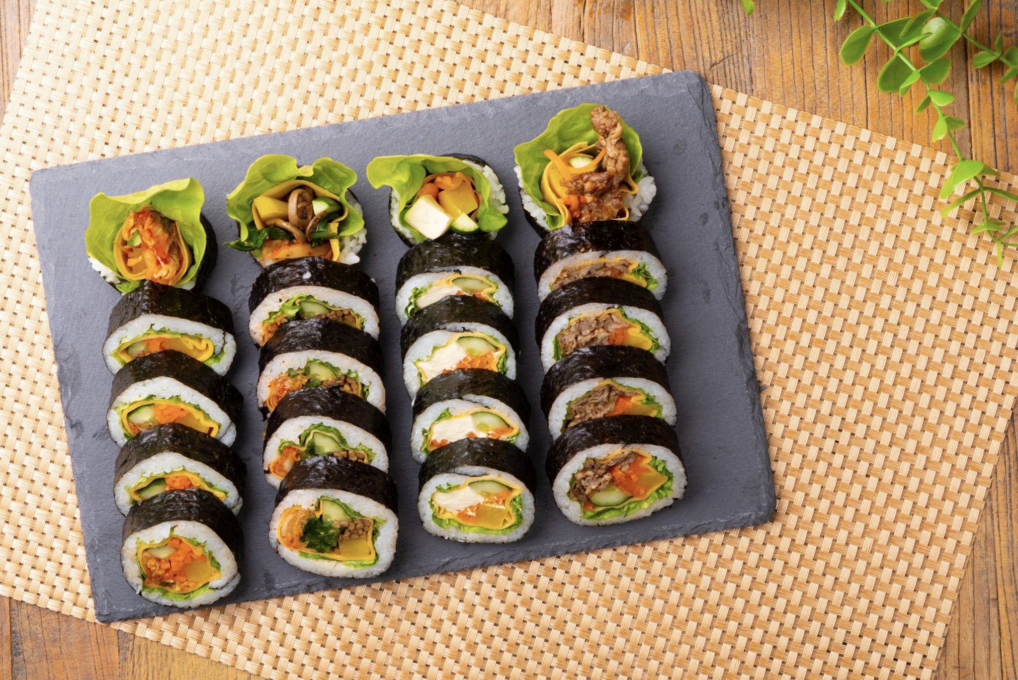韓国風のり巻き。たっぷりの具材にごま油と塩で味付けしたごはんを巻いた当店イチオシのメニューです。牛カルビを巻いた「プルコギ」、本場韓国のキムチを巻いた「キムチ」、濃厚なクリームチーズを巻いた「チーズ」、手作りナムルを巻いた「ビビンバ」、正直みんな美味しいからどれがおすすめか決められません!