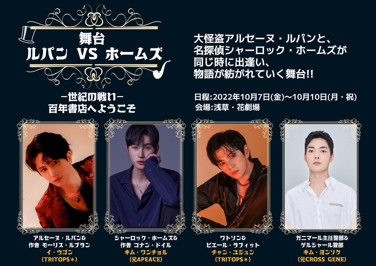 注目されるのは、出演キャストが物語上の人物と作者たちとそれぞれ1人二役を演じる点。第一弾決定キャストとして、 ルパンと作者ルブランを演じるのは、 K-POPボーカルグループTRITOPS*のメンバーとして日本でも活動しているイ・ウゴン。 ホームズと作者ドイルを演じるのは、Apeaceのメンバーとして活躍し、現在はソロで活動し日本でも人気を誇るキム・ワンチョルが決定。