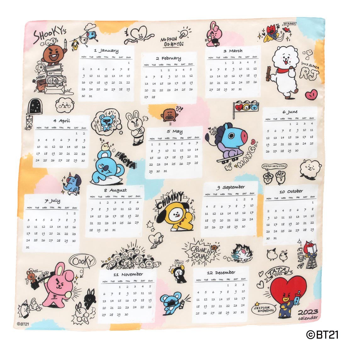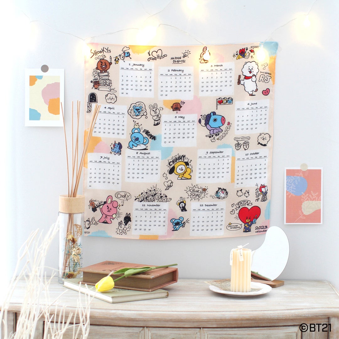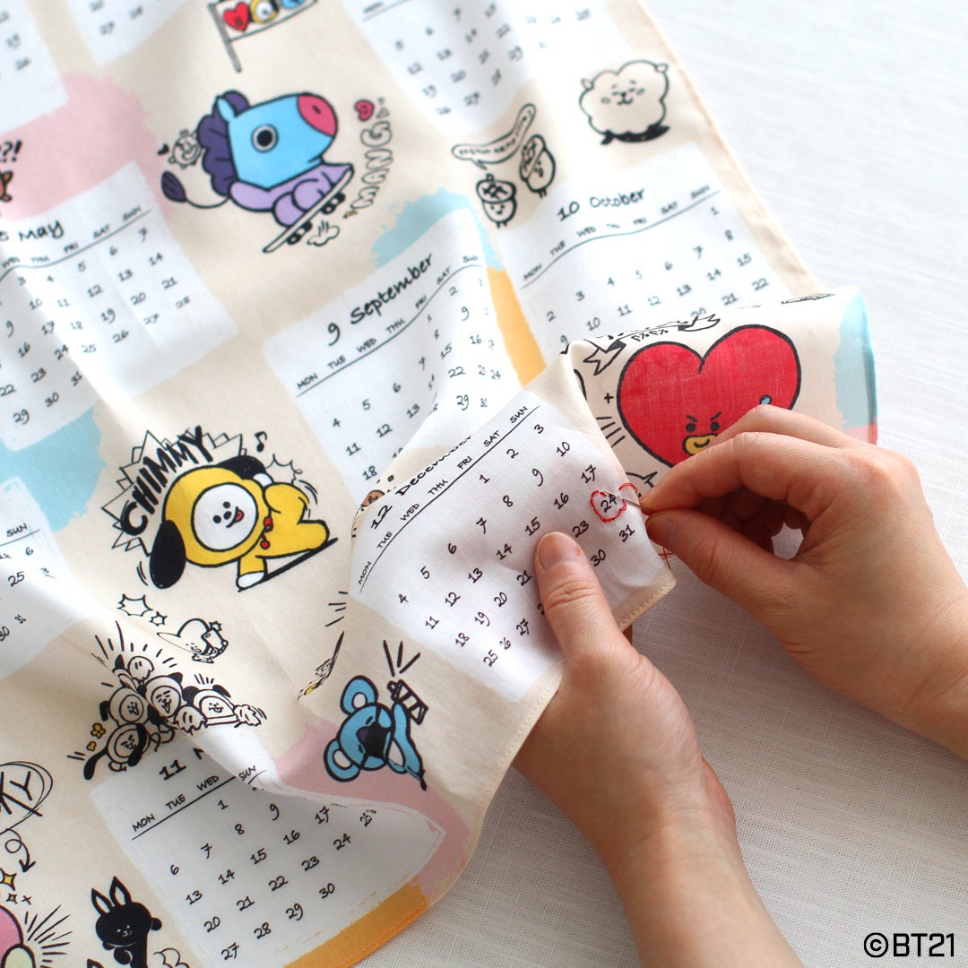 2022年のカレンダーとBT21のキャラクター(KOYA、RJ、SHOOKY、MANG、CHIMMY、TATA、COOKY)が描かれた特別な1枚。ハンカチとしてはもちろん、カレンダーとしてお部屋に飾るのもおすすめです。