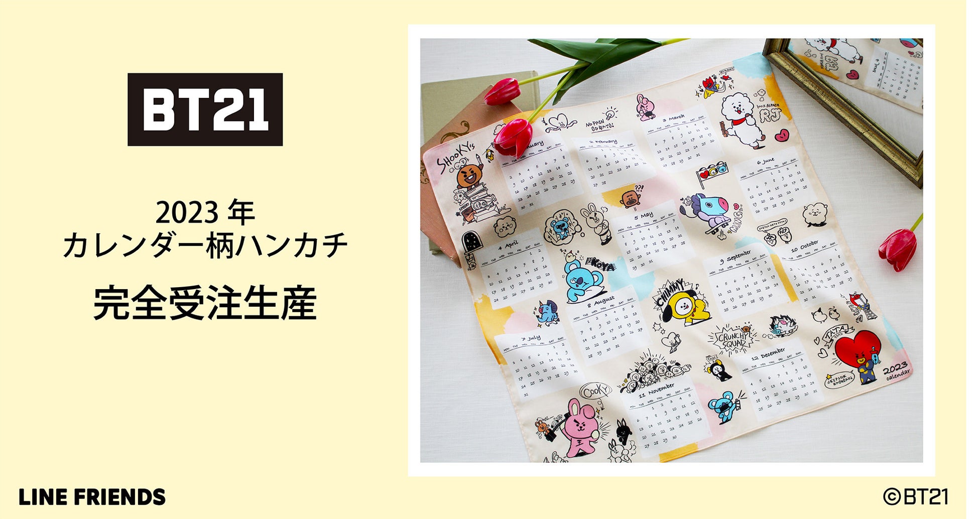 繊維製品企画販売のブルーミング中西株式会社は、「LINE FRIENDS」のグローバル人気キャラクターブランドである『BT21』のカレンダー柄ハンカチを、2022年8月18日(木)正午12時から、2022年9月8日(木)午後5時までの期間、当社直営のオンラインショップ【ハンカチーフギャラリー】で予約受付を開始します。