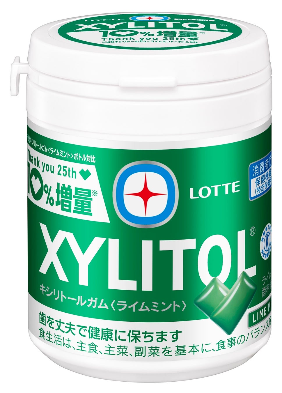- 内容量は、通常の「キシリトールガム<ライムミント>ファミリーボトル」の10%増量です。