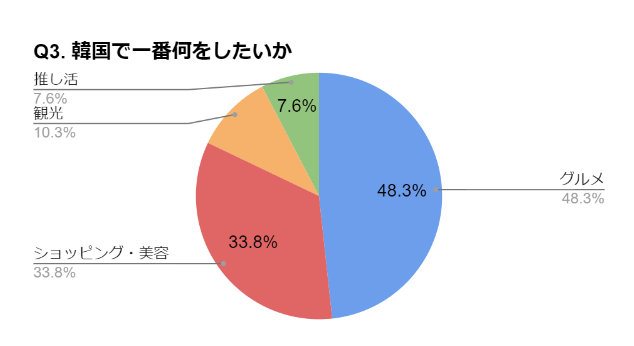 「韓国で一番何をしたいか」について、グルメが48.3%、ショッピング・美容が33.8%、観光が10.3%、推し活が7.6%という結果になりました。