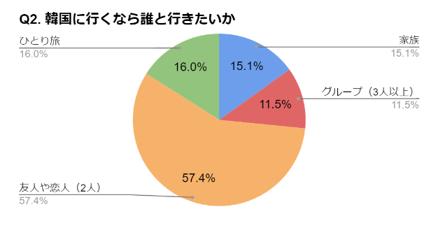 Q1で韓国に行きたいと回答された方への追加質問、「韓国に行くなら誰と行きたいか」について、ひとり旅が16.0%、友人や恋人(2人)が57.4%、グループ(3人以上)が11.5%、家族が15.1%という結果になりました。