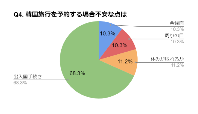 「韓国旅行を予約する場合不安な点は何か」について、出入国手続きが68.3%、休みが取れるかが11.2%、周りの目と金銭面が同率で10.3%という結果になりました。