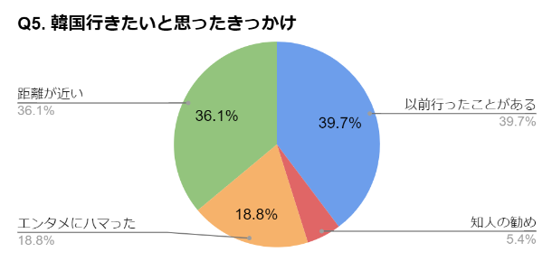 「韓国に行きたいと思ったきっかけ」について、以前行ったことがあるが39.7%、距離が近いが36.1%、エンタメ(ドラマやアイドルなど)にハマったが18.8%、知人の勧めが5.4%という結果になりました。