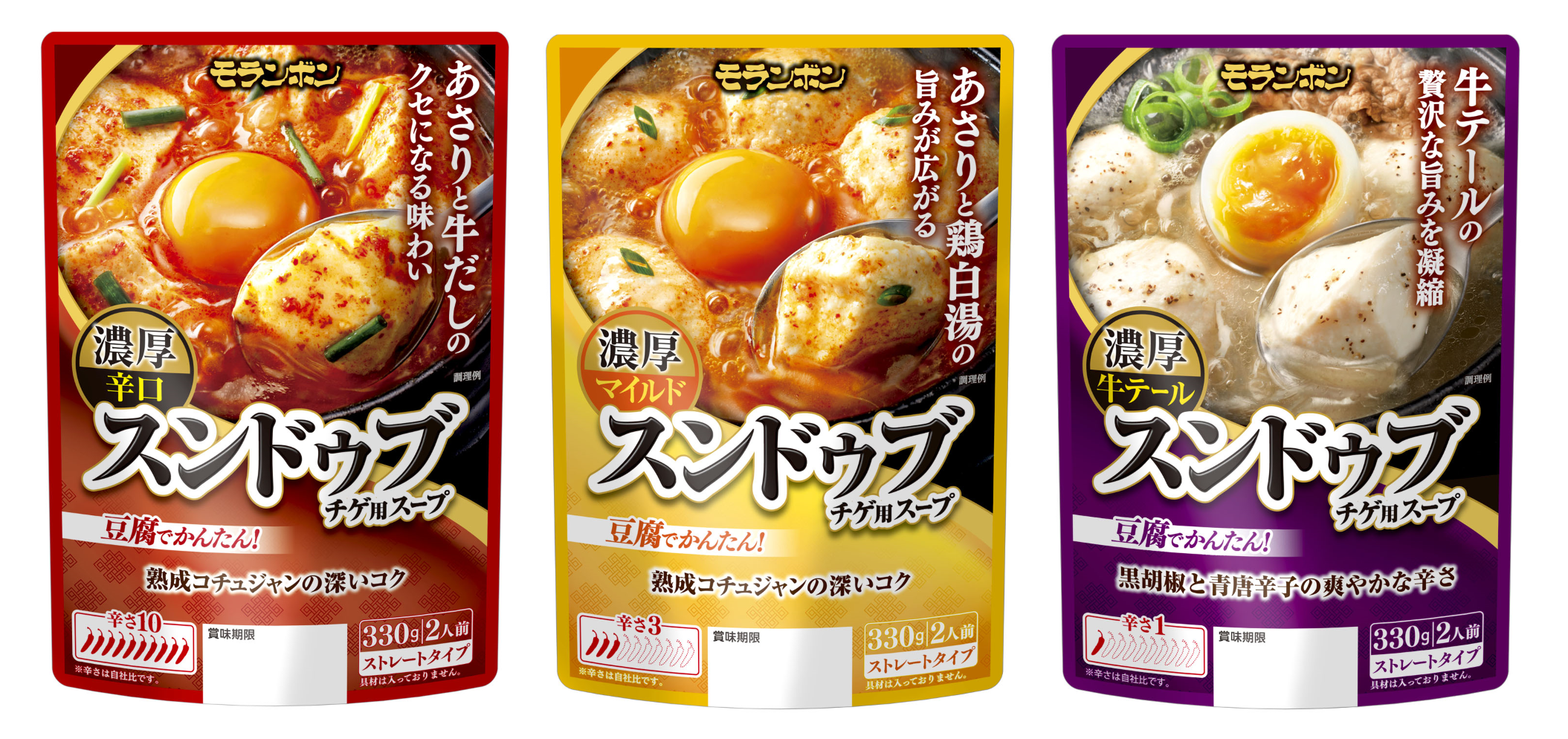 弊社のスンドゥブチゲ用スープシリーズにおいて「濃厚辛口・濃厚マイルド」は2022年2月にリニューアル、従来の商品に熟成コチュジャンを新配合することでよりコク深い辛さを追加し、あさりの旨みを強調したことで外食店のような豊かな旨みを追求しました。また新商品の「濃厚牛テール」については牛テールの贅沢な旨みを凝縮し黒胡椒と青唐辛子をアクセントにした爽やかな辛さが特徴となっています。