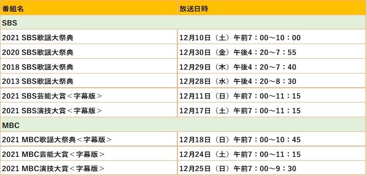年明け1月1日(日)は『2022 SBS演技大賞』を日本初放送。キム・ナムギル主演『悪の心を読む者たち』(原題)、アン・ヒョソプ主演『社内お見合い』、イム・スヒャン&ソンフン主演『私たちは今日から』(原題)、ソ・ヒョンジン&ファン・イニョプ主演『なぜオ・スジェなのか』(原題)などを放送したSBSドラマの受賞にも注目です!また、BTSが出演した過去の歌謡大祭典や去年の年末授賞式の模様もアンコール放送します。
