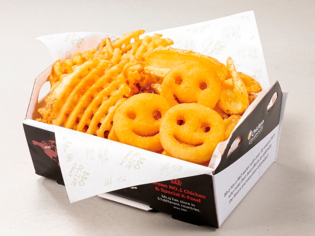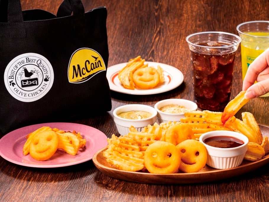 今回開催する「WE LOVE POTATOダブルキャンペーン」では、チキンのお供として定番のフライドポテトのスペシャルメニューを用意。マッケインの人気フライドポテト3種(クリスパーズ、スマイルポテト、ワッフルポテト)をbb.qオリーブチキンカフェ自慢のディップソース3種で楽しめる「トリプルフライドポテトボックス(ディップソース3種付き)」(税込880円)を国内全店舗で販売いたします。