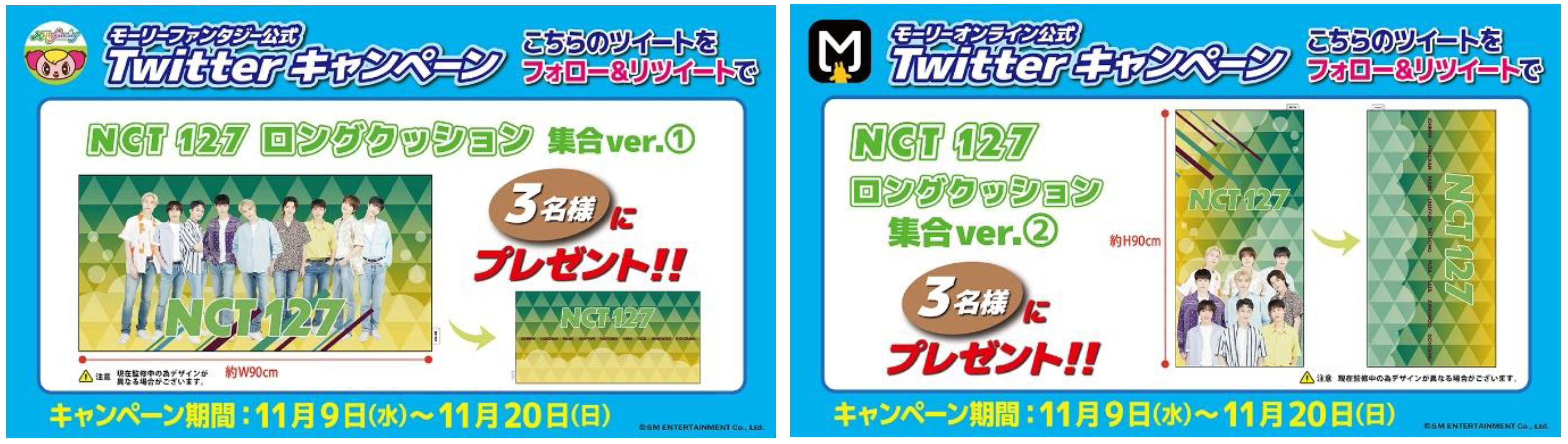 限定プライズゲーム用景品の展開を記念し、モーリーファンタジー公式 Twitter、モーリーオンライン公式Twitterでは限定デザインの「NCT 127ロングクッション集合ver.」が当たるプレゼントキャンペーンを開催いたします。
