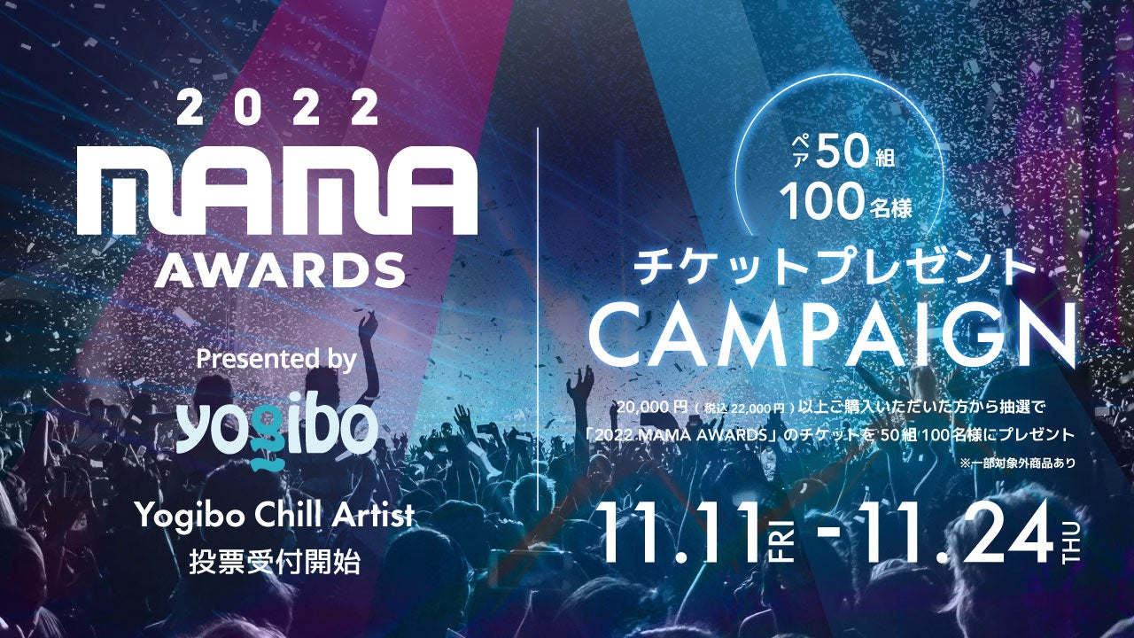キャンペーン期間中にYogibo StoreおよびYogibo公式オンラインストアにて、20,000円(税込22,000円)以上購入いただいた方から、抽選で11月29日(火)・30日(水)に開催する『2022 MAMA AWARDS Presented by Yogibo』の観覧チケットを50組100名様にプレゼントいたします。