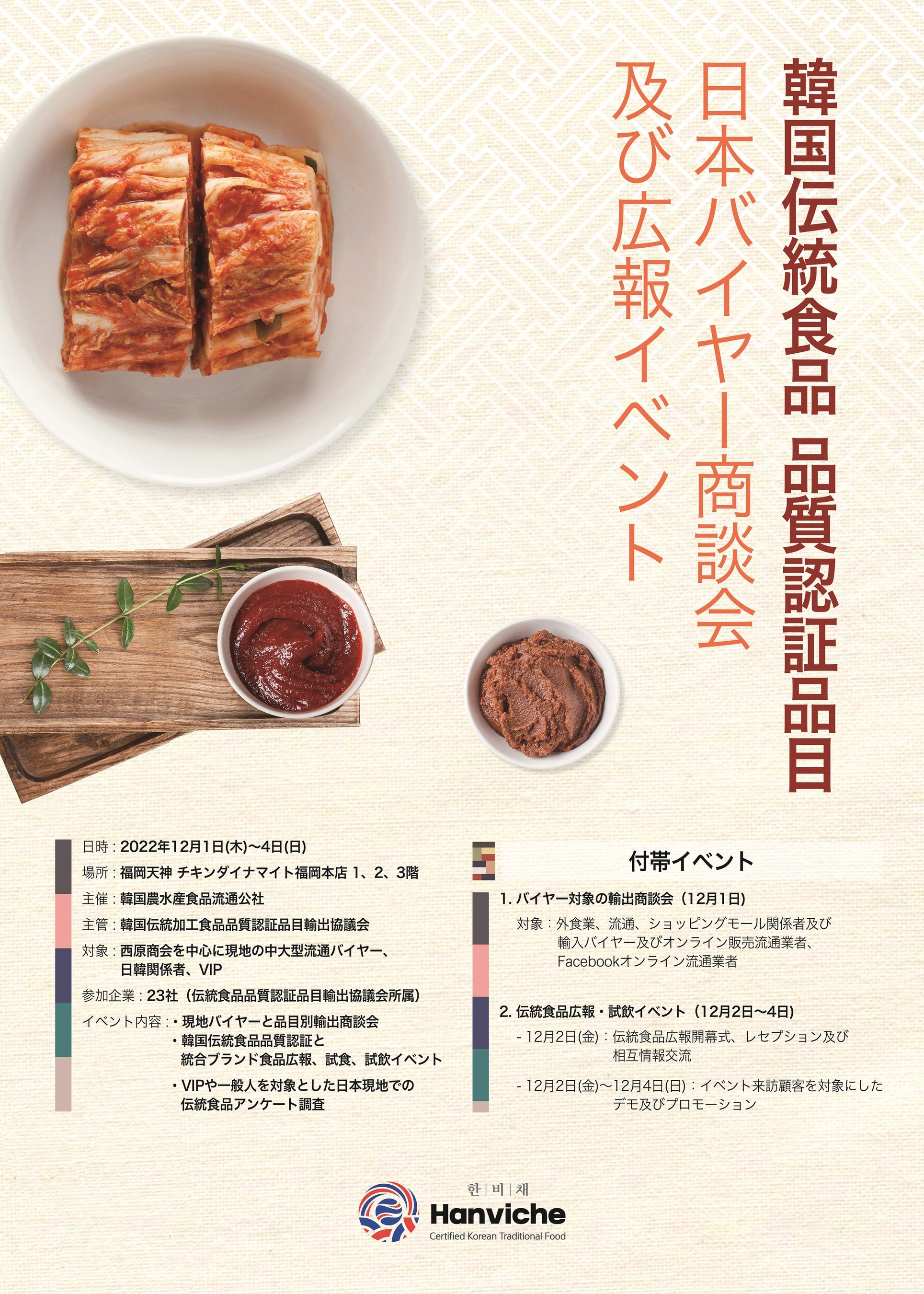 株式会社JWORLD (本社:福岡県福岡市中央区、代表:大野 濟政)が「韓国伝統食品輸出協議会」を日本に招いて、2022年12月1日(木)から12月4日(日)に福岡・博多の飲食店「チキンダイナマイト」で「韓国伝統食品輸出協議会広報イベント 2022 in 福岡」を開催いたします。伝統食品品質認定品目輸出協議会所属の23企業が厳選された食材を出展し、会場で、その伝統食品国旧食材を実際に使った料理をご飲食いただきながら、韓国の伝統文化をお楽しみいただけます。12月1日はバイヤー向け商談会となっており、一般向けは、12月2日~4日となっています。