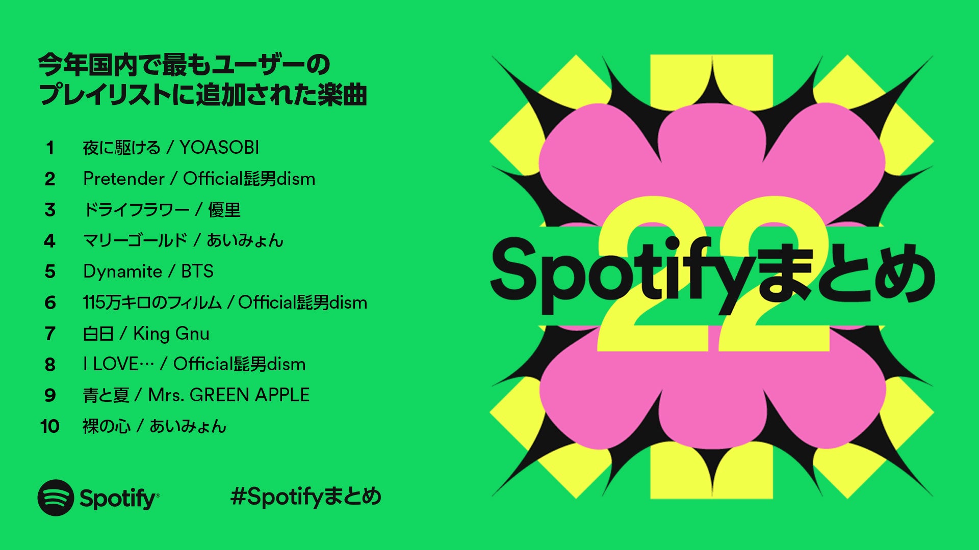 一方、ユーザーが自身で作成したプレイリストに今年最も追加した楽曲は、YOASOBI「夜に駆ける」となりました。また2位に「Pretender」がランクインしたOfficial髭男dismは、「115万キロのフィルム」(6位)、「I LOVE...」(8位)を含む3曲がトップ10にエントリーしました。