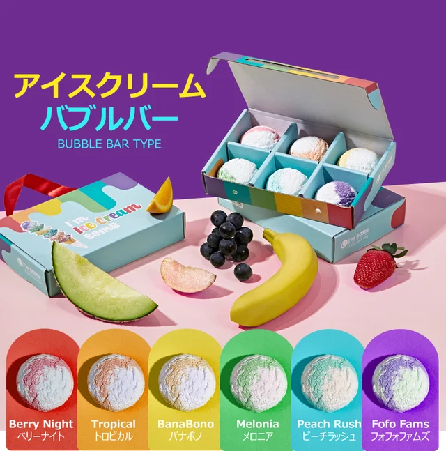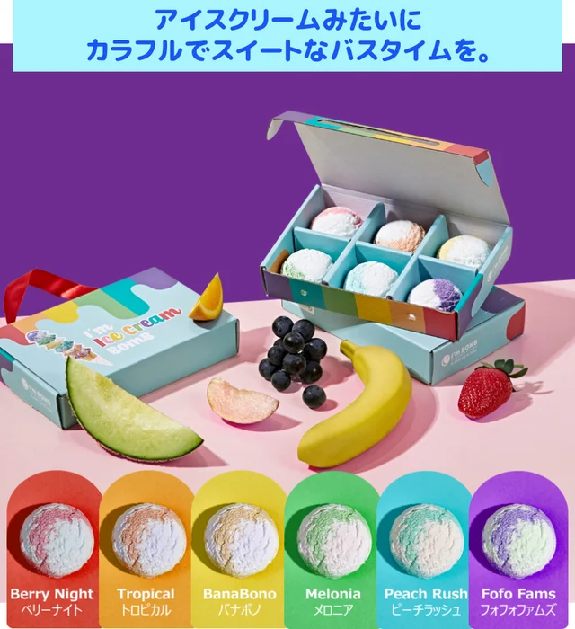 6種類の甘いフルーティーな香りに包まれて、カラフルでスイートなバスタイムをお過ごしください。