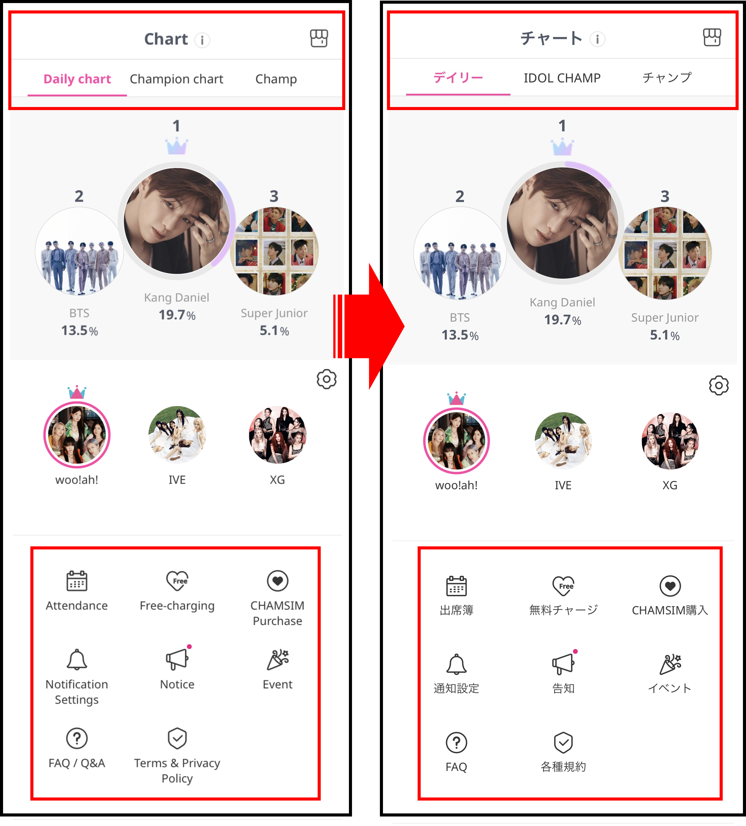 これまで、日本のファンの皆様には、SNSでの情報交換や、有志の方が作成された日本語ガイドを共有するなどして『IDOLCHAMP』をお楽しみいただいておりましたが、このたび日本語に対応したことにより快適にご利用いただけることとなりました。