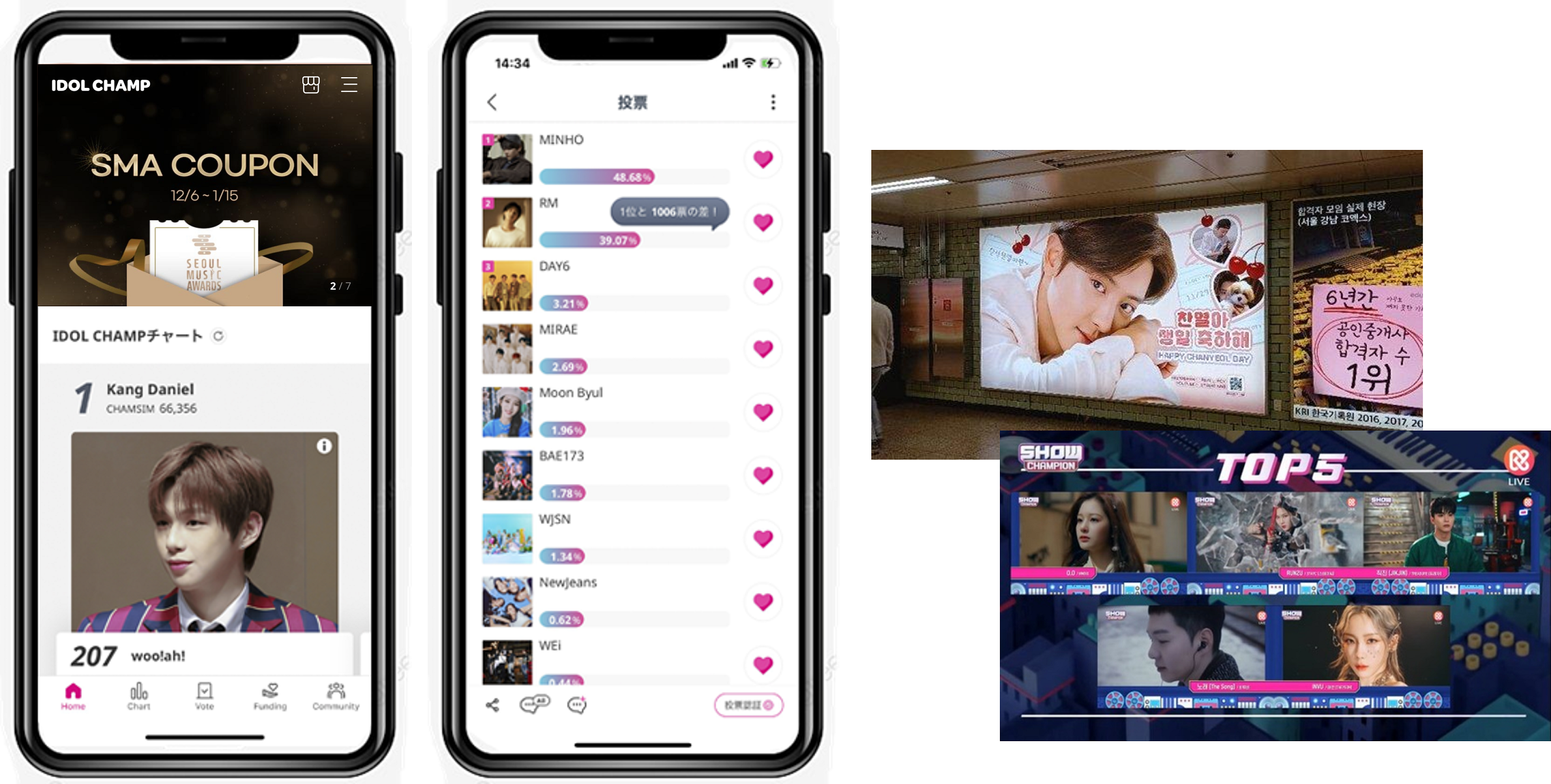 また、アプリでは番組投票以外にも様々なトピックで投票が行われており、そこで1位となったアーティストは、街頭ビジョン広告や駅構内の広告スペースなどに応援広告が掲示されたり、アーティスト名義で寄付活動が行われます。特に、『Forbes(韓国版)』といった著名な雑誌やミュージックアワードに出演するアーティストを選出する投票とも連動しており、毎年大きな盛り上がりを見せています。