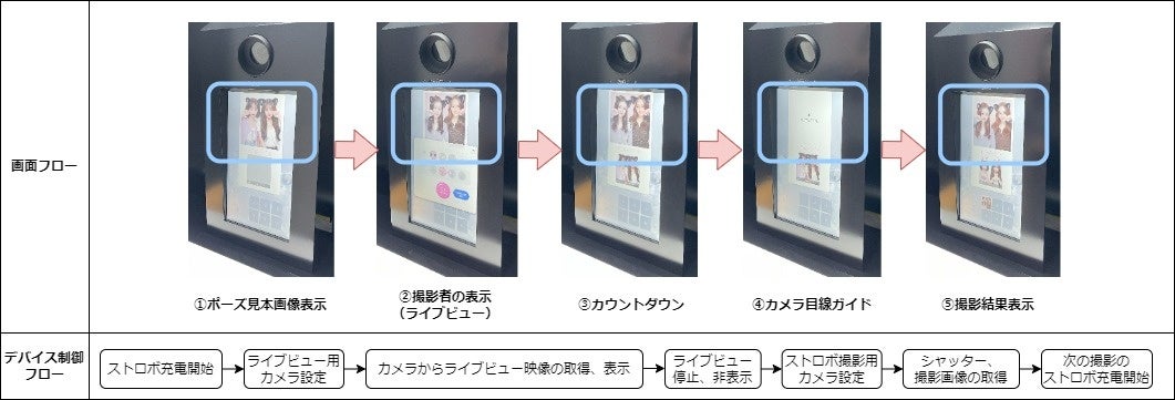 プリントシール(プリ)機での撮影は「いかにテンポよくユーザーに撮影してもらうか」が重要です。撮影は、①ポーズ見本画像表示②ポーズ見本画像を見ながらユーザーがポーズ(ライブビュー表示)③撮影カウントダウンにあわせてユーザーがカメラ目線④シャッターを切る⑤撮影結果表示という流れになっていて、多数のステップをストレスなく進行する必要があります。