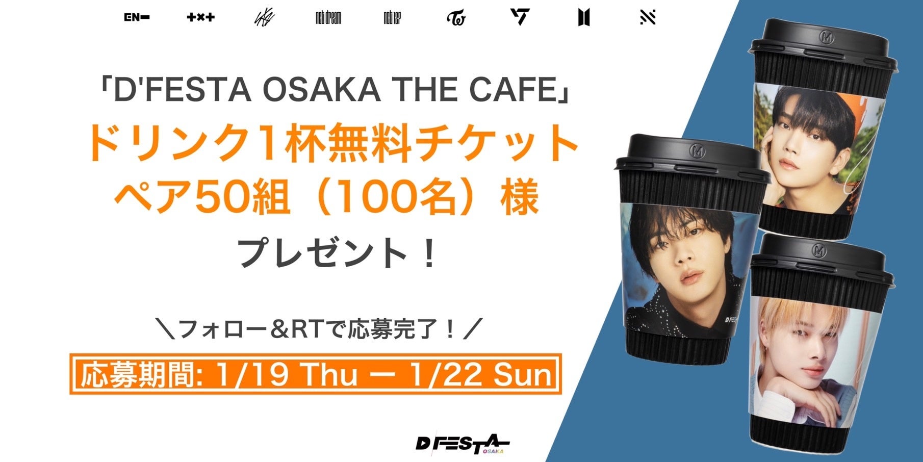「D'FESTA OSAKA」に多くのお客様にご来場いただいたことを記念して、「D'FESTA OSAKA」内のコンテンツ「THE CAFE」で使用できるドリンク1杯無料チケットをペア50組(100名)様にプレゼントします。