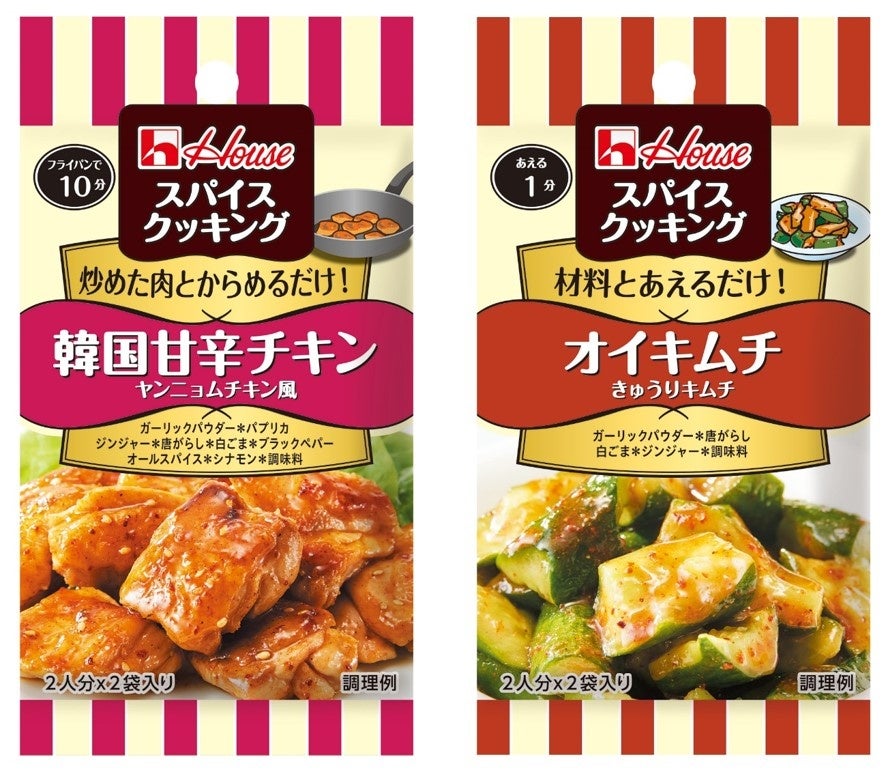 ハウス食品は、メニュー専用シーズニング「スパイスクッキング」シリーズから、<韓国甘辛チキン ヤンニョムチキン風><オイキムチ>の2アイテムを、2月13日からスーパーなどで発売します。定番の食材である「鶏肉」や「きゅうり」を使って、トレンドの韓国メニューの味わいを家庭で簡単に楽しむことができます。2人分×2袋。オープン価格 (税別参考小売価格110円)。