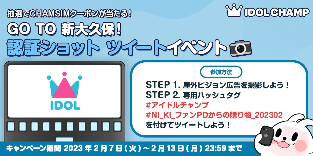 応援広告の上映を記念して、期間中に上映中の広告を撮影し、イベント専用ハッシュタグと一緒にツイートした方の中から抽選で30名様に200CHAMSIMクーポンをプレゼントするキャンペーンを開催いたします。また、現地に行けない方向けに、運営チームのサンプルツイ―トに「いいね」または「RT」を行うと、抽選で50CHAMSIMをプレゼントいたします。
