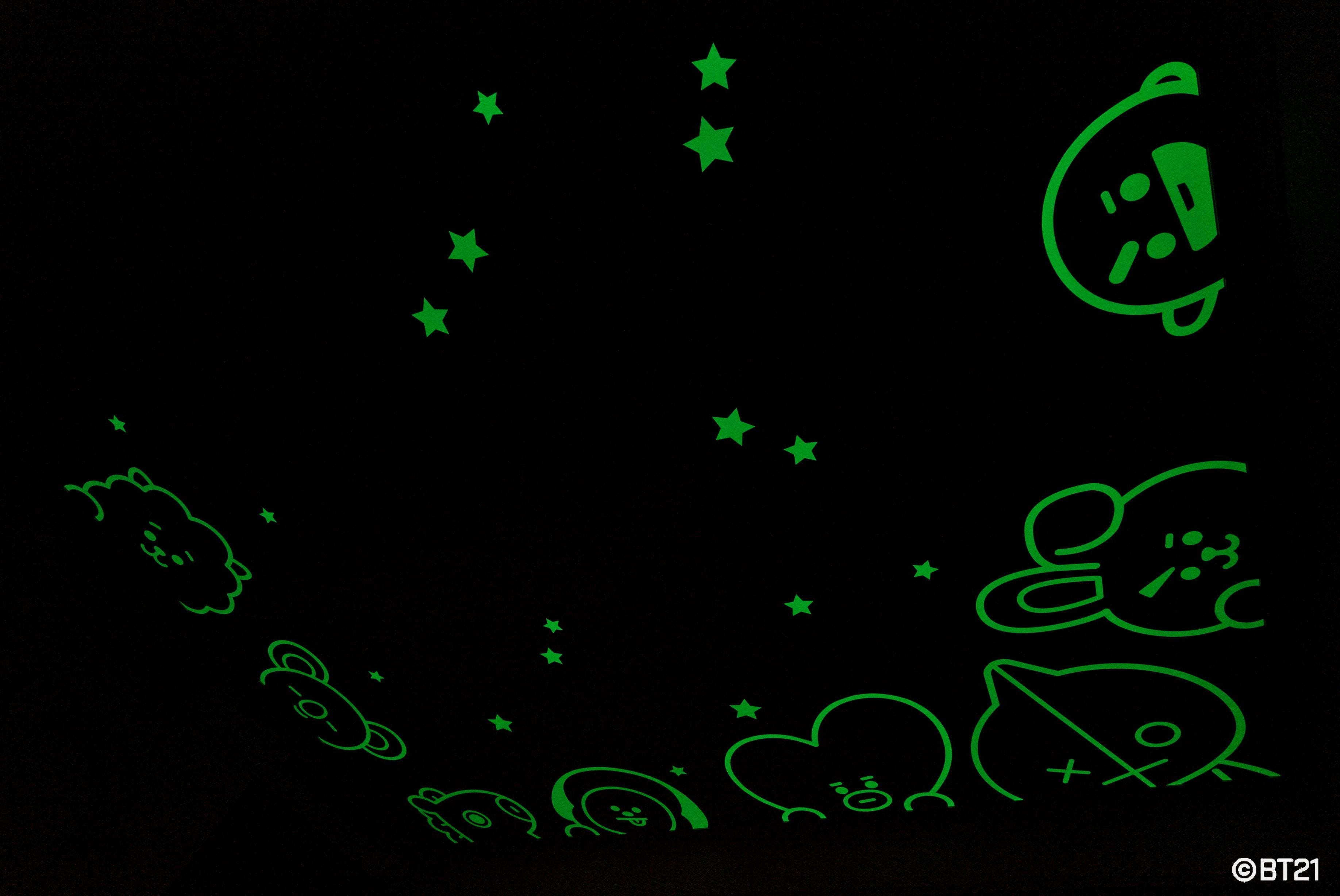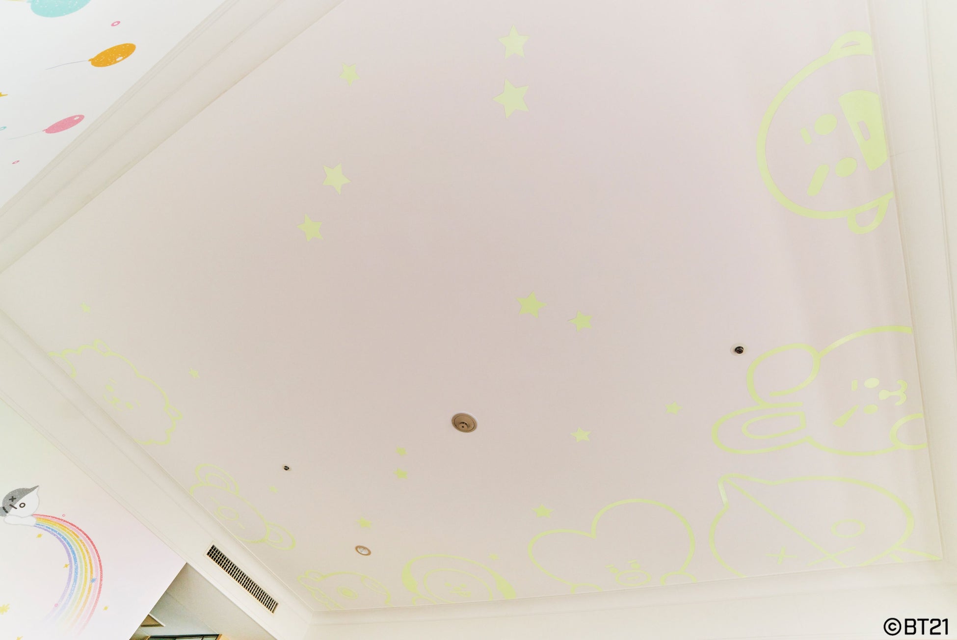 さらに夜になって室内を暗くすると…なんと天井からキャラクターたちが覗いてる!?おやすみのその瞬間まで、BT21のキャラクターたちにやさしく見守られながらお過ごしいただけます。