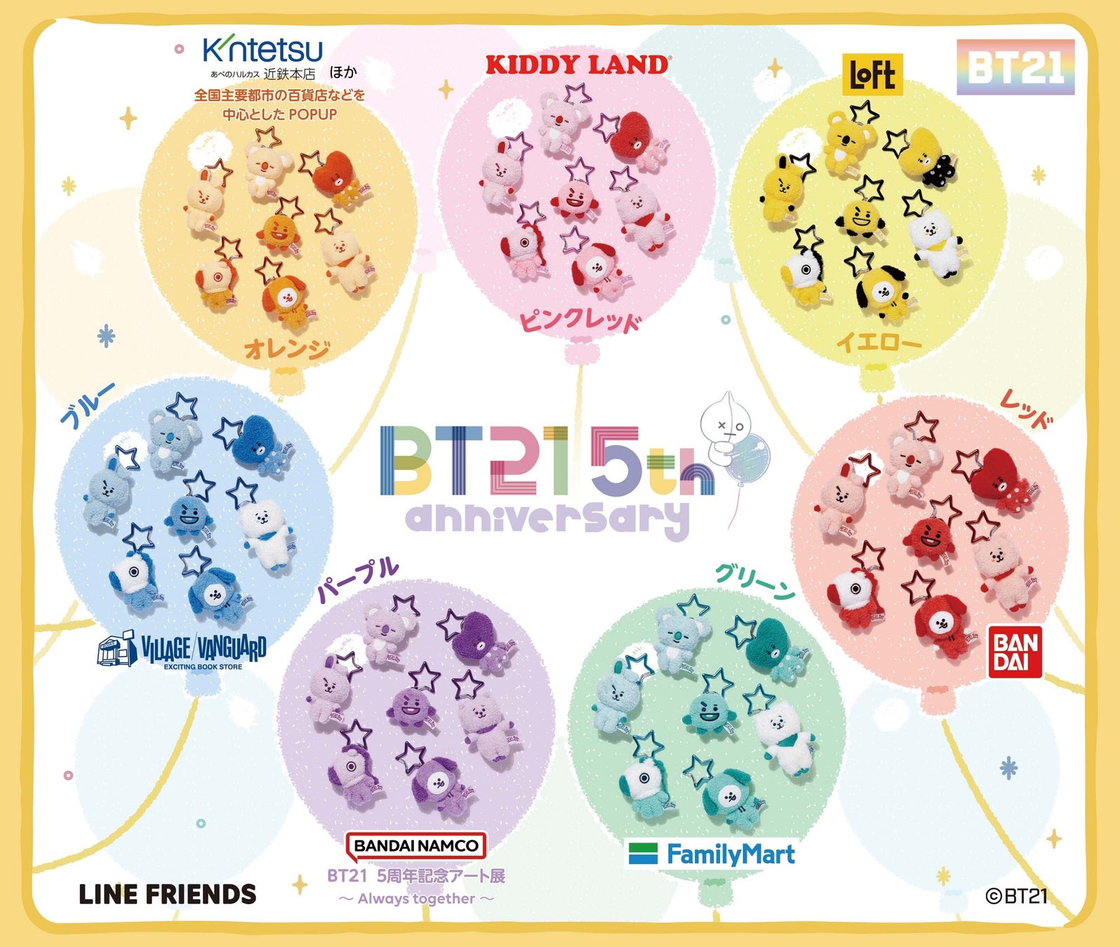 BT21 5周年記念レインボーカラーマスコットに関する販売情報やBT21の5周年企画に関する詳細はこちら