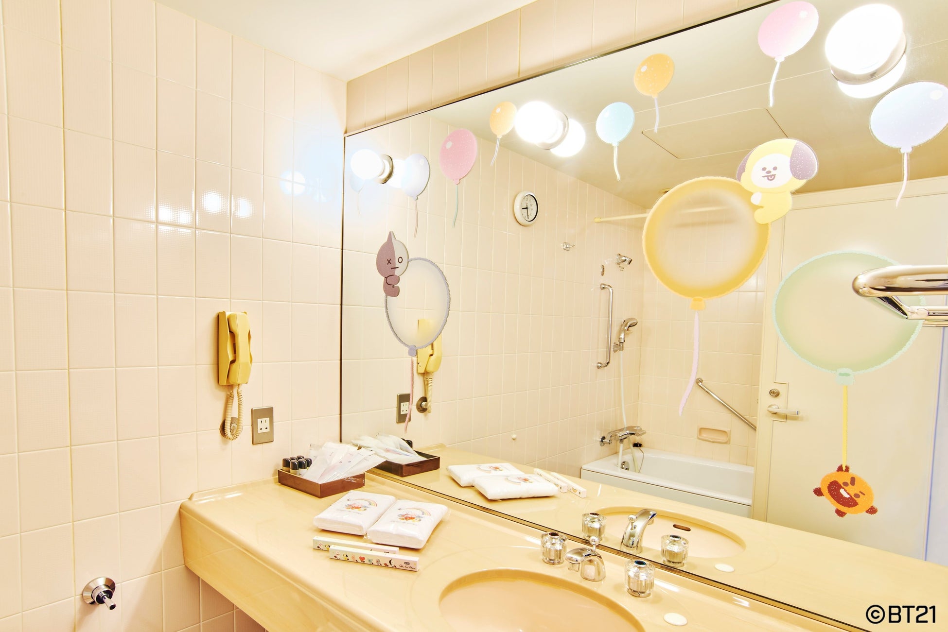バスルームのミラーにはSNS映えバッチリの、BT21のキャラクターと一緒に撮影できる顔出しフォトスポットをご用意。
