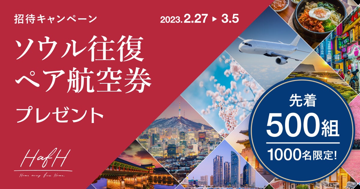 続いて、2月27日より第2弾として、お友達招待で先着500組1000名に韓国旅行の往復航空券をプレゼントする「ソウル往復ペア航空券がもらえる招待キャンペーン」を開始します。