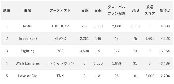 (※)各スコアの割合音源35%、音盤15%、グローバルファン投票(アプリ)20%、SNS10%、放送スコア20%
