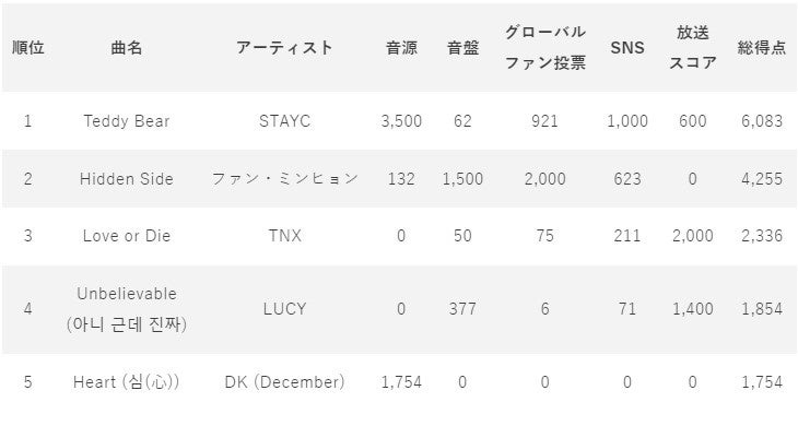| ■3月8日(水)の放送回でSTAYCのTeddy Bearが総得点で1位を獲得! |