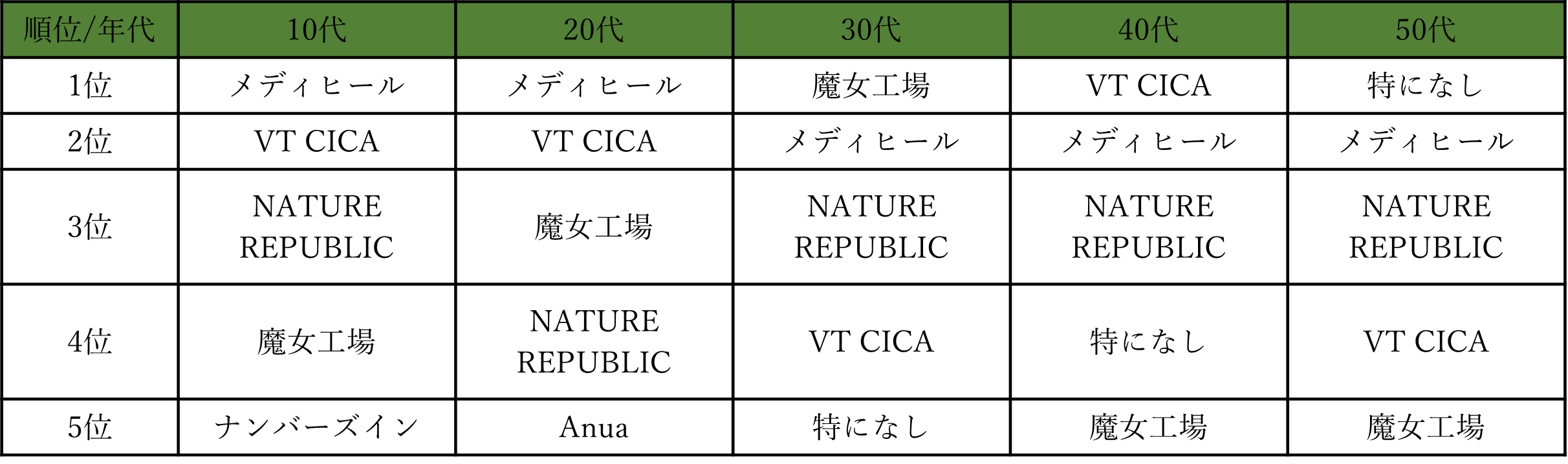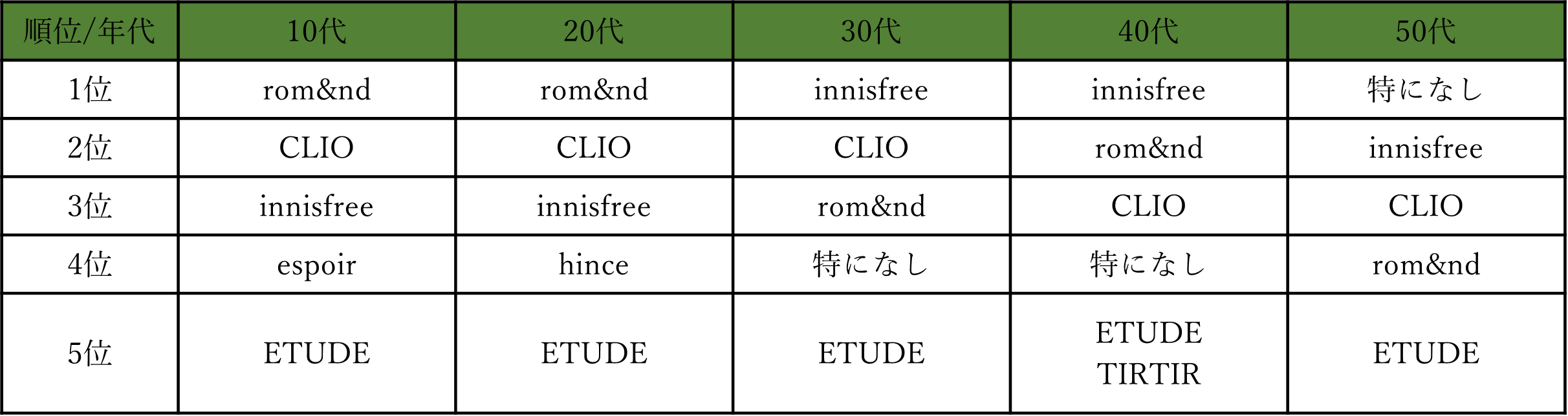 年代別お気に入りの韓国コスメブランドは下記となりました。