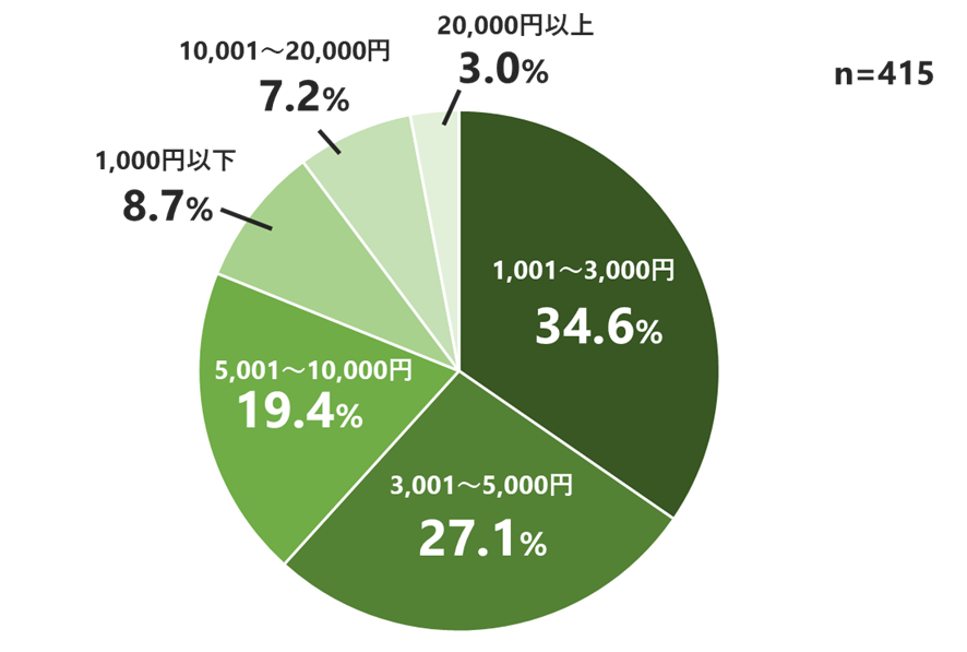 30代から40代とコスメ用品代の月額平均が上がり、20代以下は月額5,000円の範囲でコスメ用品を購入していることが分かりました。