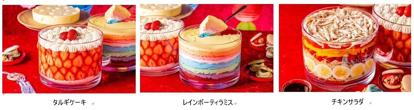 直径20センチのグラスに隙間なく並べた、韓国語で“いちご”を意味するいちごを贅沢に使った「タルギケーキ」や、7色のカラフルなクリームの層を重ねた「レインボーティラミス」、たくさんの具材を積み上げた「チキンサラダ」など、見た目も楽しめるメニューをご用意しております。