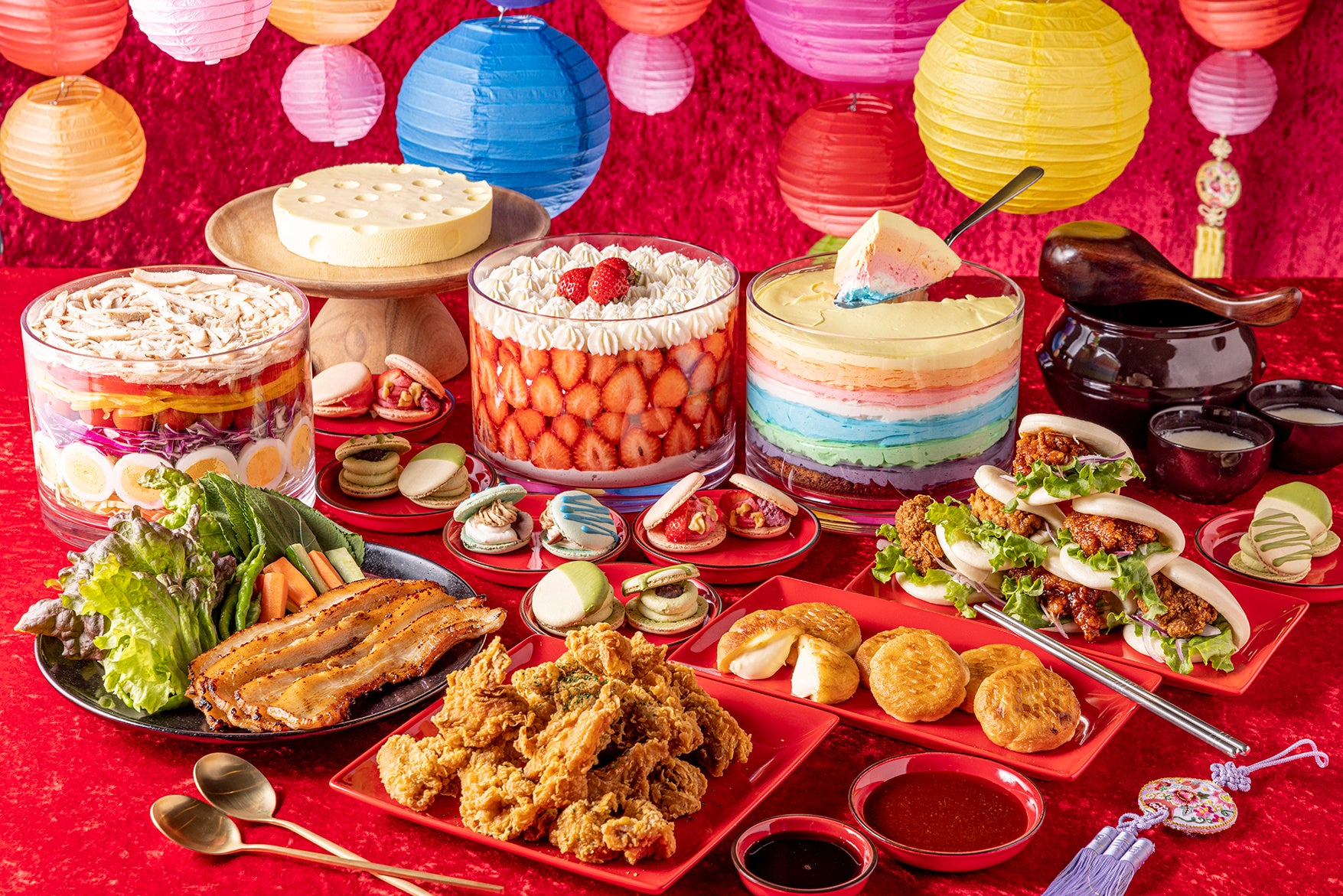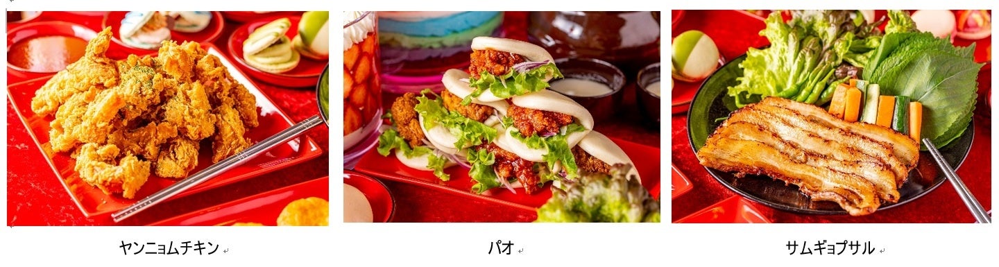 ナムルの盛合せや白菜キムチなど韓国の定番前菜から、甘辛いソースで味付けされた韓国のフライドチキン「ヤンニョムチキン」、ふわふわでほんのり甘い生地にソースがたっぷり染み込んだヤンニョムチキンをサンドした「パオ」。豚肉の三枚肉「サムギョプサル」、豚肉のコチュジャン炒め「ゼコックボックム」、プルコギチャプチェなど韓国のお肉料理も勢揃いします。さらにトマトベースのソースや生クリームやホワイトソースを混ぜてロゼ色(バラ色)にし、カレー粉やコチュジャンを加えた“ロゼクリーム”でお召し上がりいただく、今韓国で大注目のトレンドフード「ロゼトッポギ」も登場いたします。