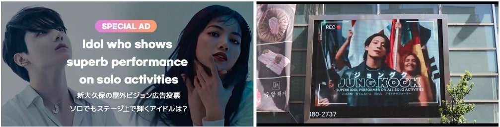 2023年3月22日(水)から4月4日(火)までの期間で開催した、「ソロでもステージ上で輝くアイドルは?」の投票において1位に選ばれたBTSのJUNGKOOKさんの応援広告が、新大久保のK-PLAZA 1号館の屋外ビジョンで上映されます。